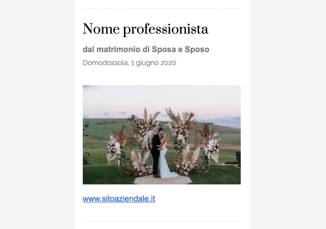 Ottava posizione e Inserimento di N°1 link verso il tuo sito o uno dei tuoi canali Social all’interno della tua foto selezionata per l’articolo “50 fotografie di matrimonio più belle del 2020”.
