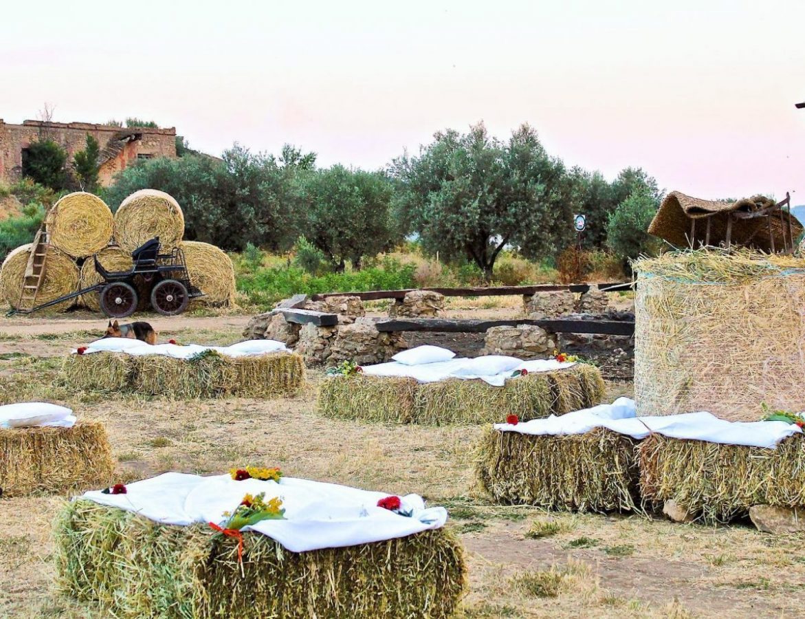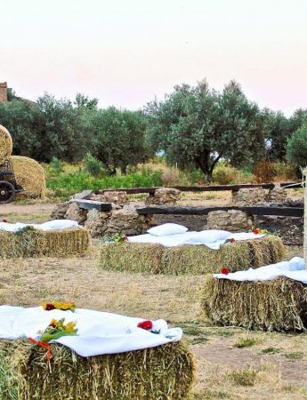 Allestimenti unconventional e informali, fra balle di fieno, tavoli imperiali attorno a cui sedersi tutti insieme. Fiori di campo e piante aromatiche.