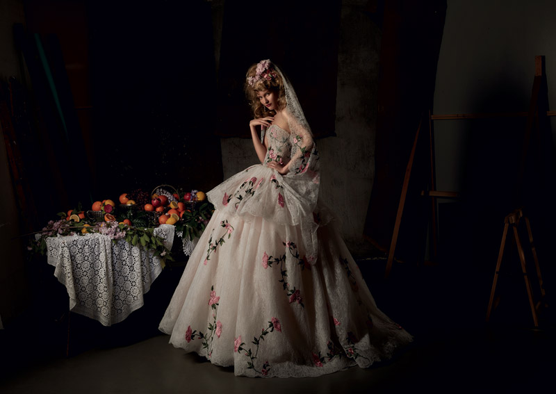 Fiori rosa e rossi, con gli steli verdi, esaltano i tessuti dal bianco candido in un mix di tradizione ed innovazione che si sposano tra loro. Il risultato finale è un armonioso equilibrio tra romanticismo e modernità. I ricami, esclusivamente fatti a mano, mettono in mostra la sartoria di alto livello che si rifà alla più classica della tradizione artigianale.