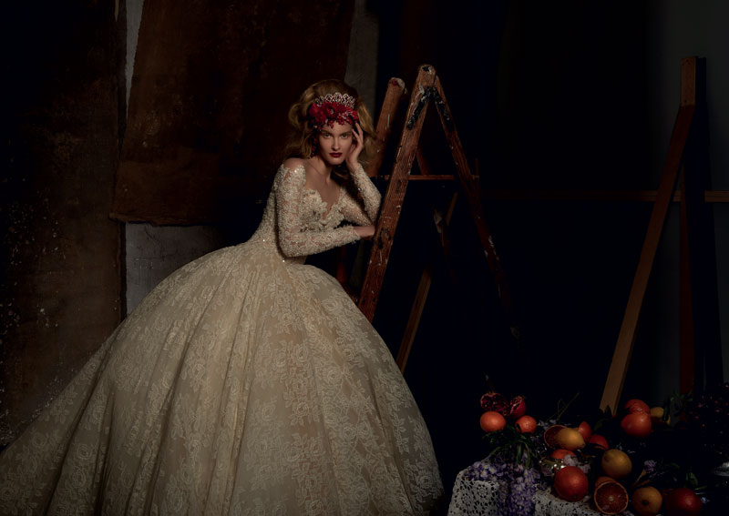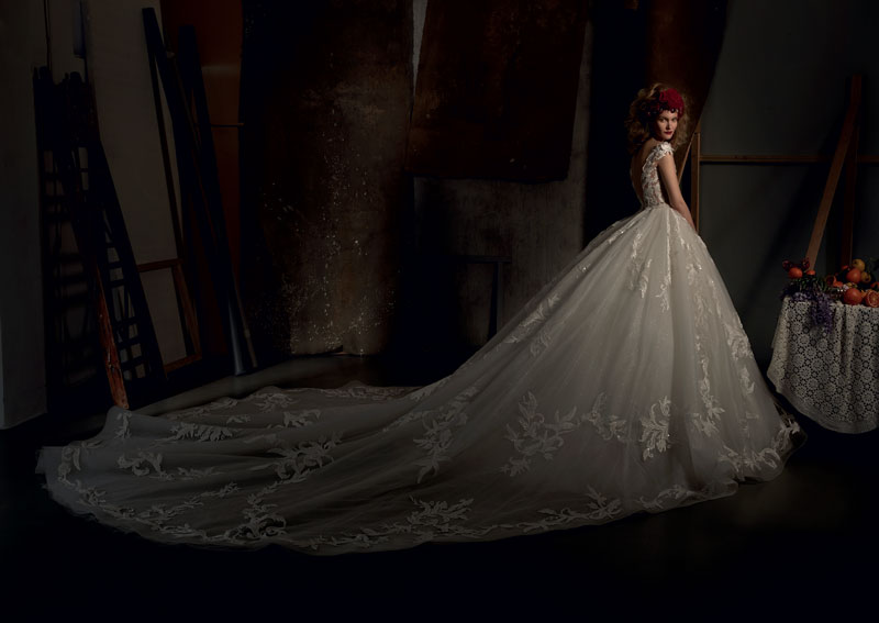 Tra i tessuti spiccano le sete italiane e il pizzo francese. E proprio quest’ultimo ritorna con prepotenza ad essere protagonista degli abiti da sposa della maison italiana ricoprendo all over il bridal dress o soltanto alcune parti in maniera strategica. Spazio alle decorazioni fatte a mano che rendono i vestiti ancor più preziosi e raffinatati.