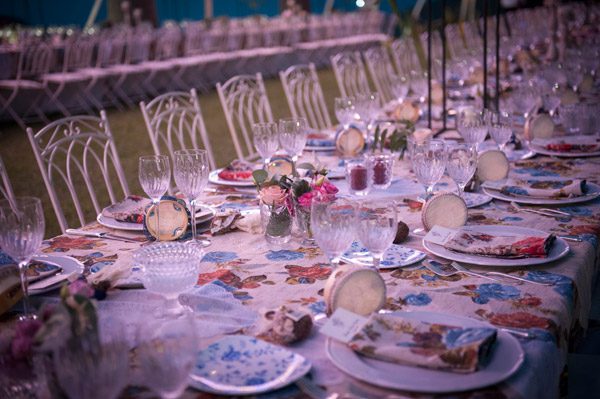 L’elemento floreale torna ancora una volta protagonista, non solo nei centrotavola ma anche nella scelta del tovagliato. Tessuti importanti con stampe a fiori che richiamano tutte le sfumature degli allestimenti: il blu, il bordeaux e il verde. Fiorati anche i piatti.