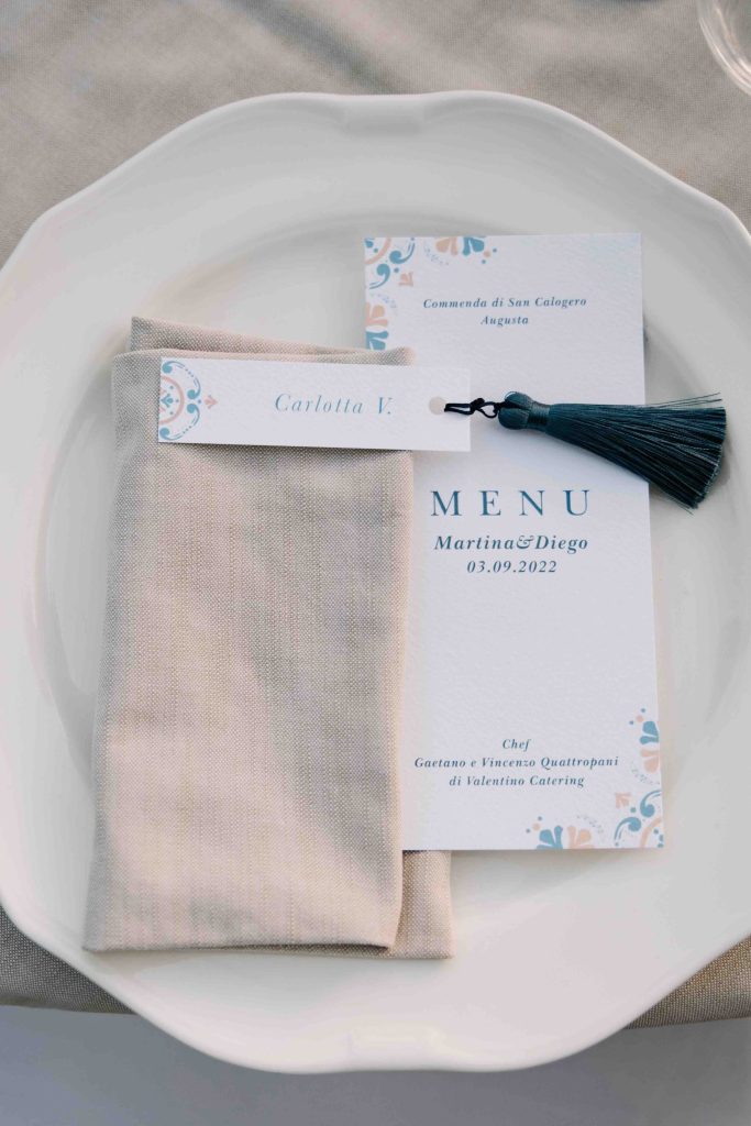 Questa delicata nuance prende vita, dunque, nei decori delle partecipazioni, dei menĂą e di tutti gli elementi cartacei ispirati alle ceramiche di Caltagirone.