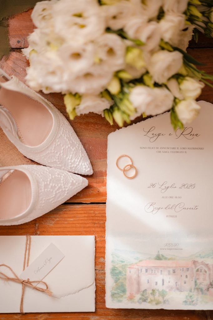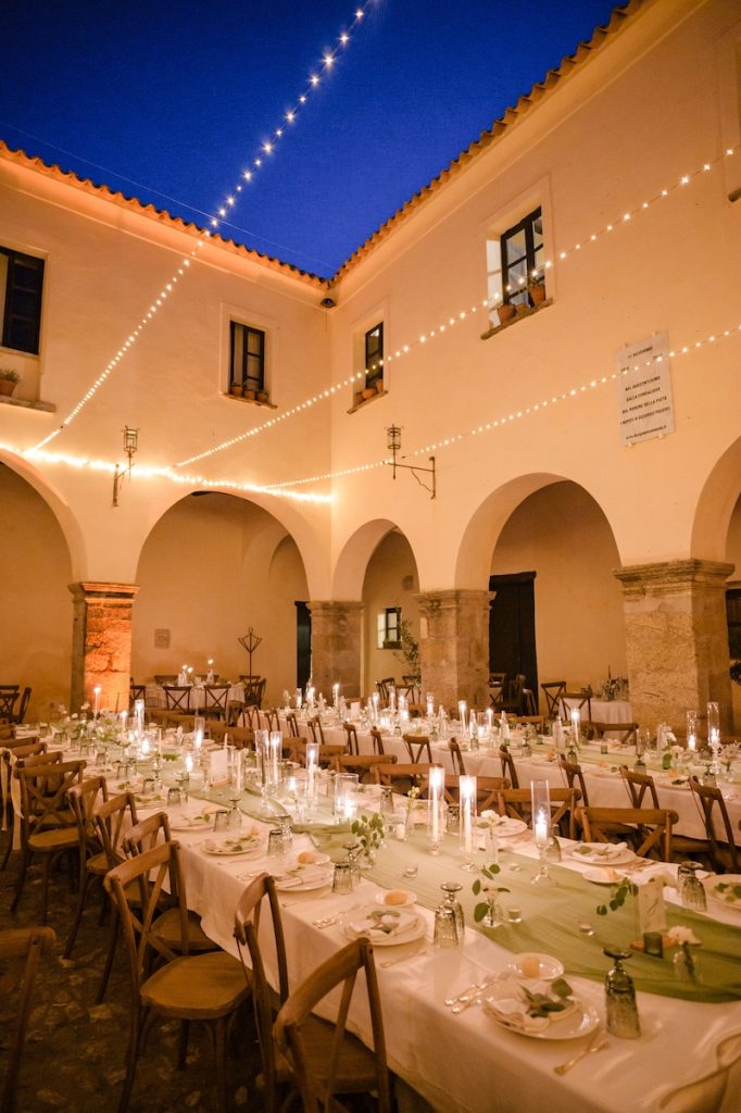 Luigi e Rosa si sono detti Sì in Calabria, nel Borgo del Convento di Petrizzi, un antico complesso monastico affacciato sul mar Ionio e hanno affidato il loro sogno d’amore alla Wedding Planner Elena Bitonte e al suo team. La cerimonia è stata celebrata tra le antiche rovine del convento, sotto un grande arco in pietra che domina la celebre “chiesa senza tetto”, adornato di composizioni floreali nei delicati toni del bianco e del verde che hanno esaltato il fascino senza tempo dell’architettura. Dopo lo scambio delle promesse, il ricevimento si è svolto nel chiostro del borgo, trasformato in uno scenario intimo e luminoso grazie a luci sospese e candele. Lunghe tavolate imperiali, decorate con runner verde salvia e dettagli botanici, hanno accolto gli ospiti per un banchetto che ha celebrato i sapori autentici della tradizione calabrese rielaborata in chiave elegante e contemporanea. Un matrimonio raffinato e profondamente legato al territorio, pensato per trasformare ogni dettaglio in un ricordo prezioso.