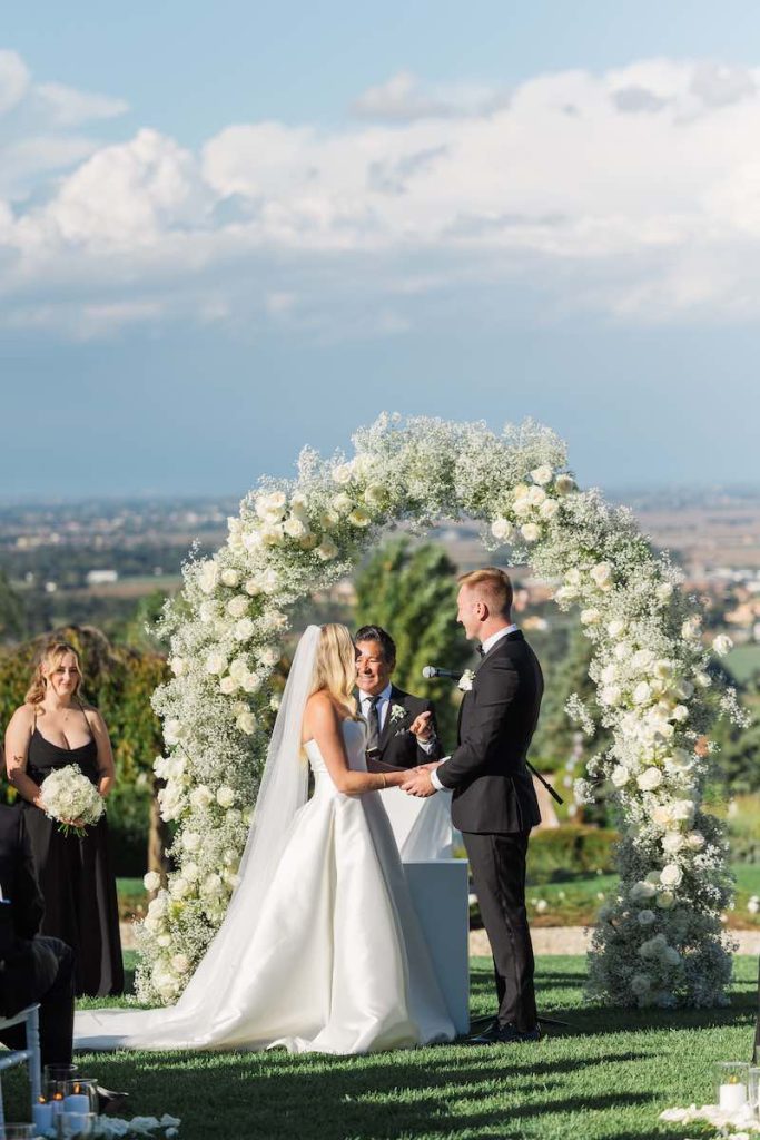 Riley e Bailey, sposi californiani innamorati dell’Italia, hanno scelto i colli bolognesi per pronunciare il proprio Sì il 24 settembre 2025, affidandosi all’esperienza di Maurizio Lo Greco. Il matrimonio è stato un vero viaggio di tre giorni tra convivialità e bellezza, dal pool party di benvenuto alla cena informale la sera precedente delle nozze e, infine, il Wedding Day a Palazzo di Varignana. La cerimonia, celebrata su un prato affacciato sulla campagna bolognese, è stata seguita da un aperitivo con drink personalizzati serviti attraverso l’originale parete “Ring For Drink”. La cena al tramonto sulla terrazza Belvedere, immersa in una palette minimal Black&White, ha raccontato con un’eleganza essenziale e contemporanea, un evento da sogno.