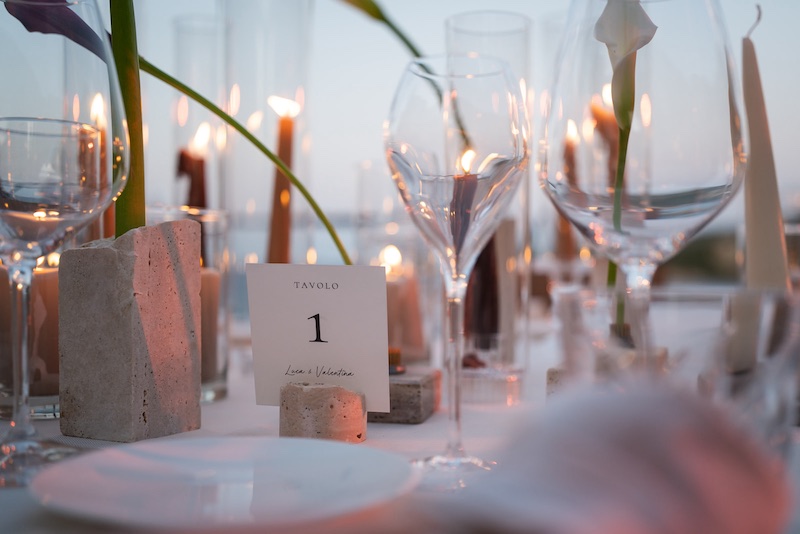 Per esaltare la bellezza del luogo e lo sfondo del mare al tramonto, la tavola ha seguito la stessa filosofia minimalista con: tovagliato color sabbia, sedute in legno, selezione di ceramiche neutre, basamenti in pietra monofiore e candele nelle tonalità tortora e marrone.