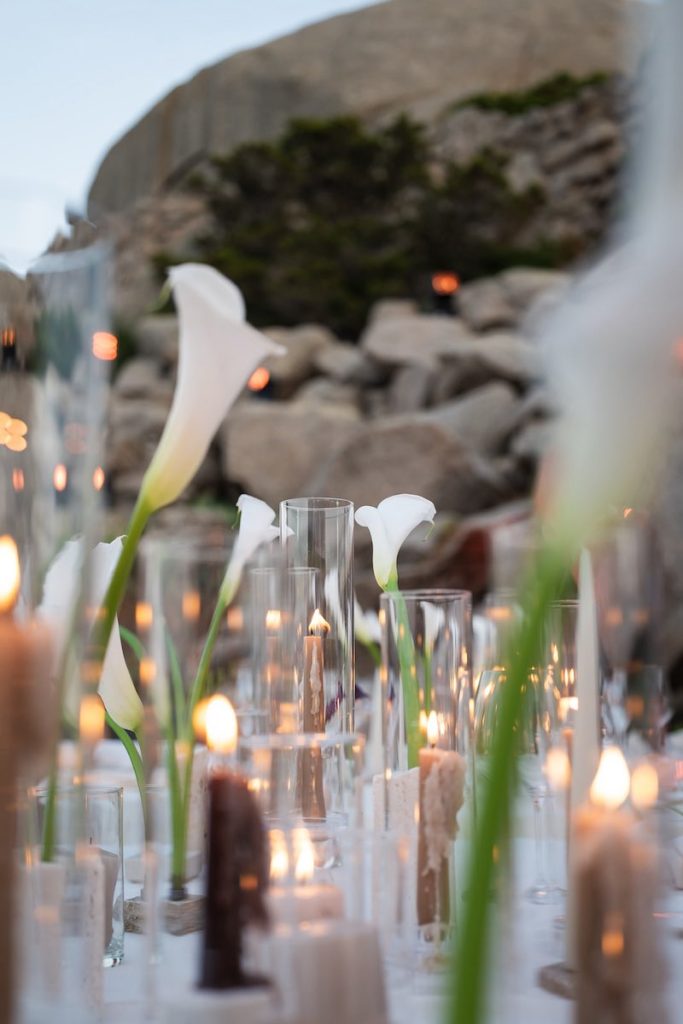 Cilindri in pietra realizzati su misura hanno accolto calle bianche e tocchi di carbone, in continuità materica con il paesaggio.