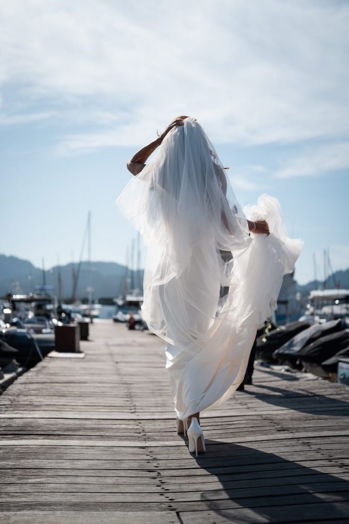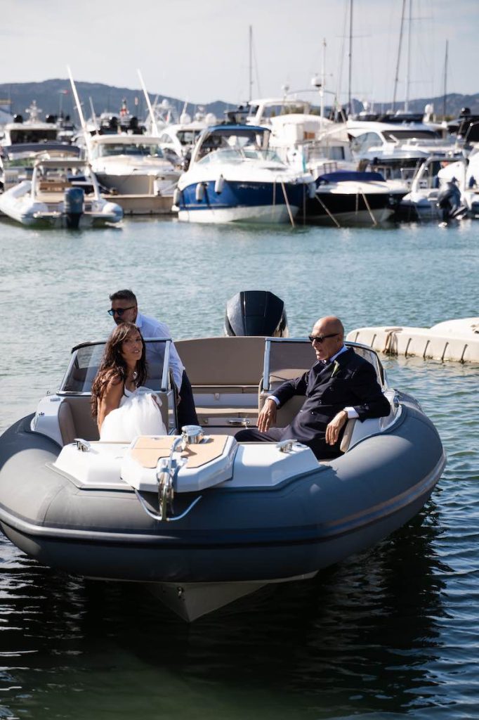 La sposa Valentina è arrivata in barca al porto, avvolta in un abito firmato Anna’s Dress.