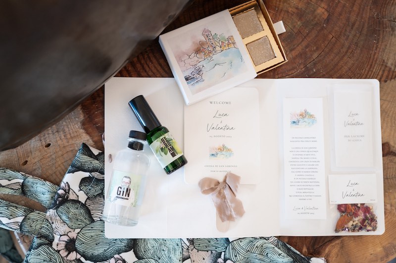 All’interno, un biglietto scritto a mano e un cadeau de mariage fuori dagli schemi: una bottiglia di GIAN TONIC, il gin firmato dallo chef Giancarlo Morelli, accompagnata da un’essenza pura di bergamotto da vaporizzare sul bordo del bicchiere.