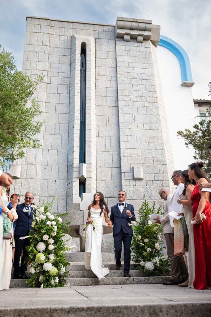 L’uscita degli sposi è stata un momento intenso, incentrato sul rito tradizionale sardo di Sa Gratzia, con il lancio del sale come augurio di prosperità e protezione, che ha aggiunto una nota simbolica al matrimonio.