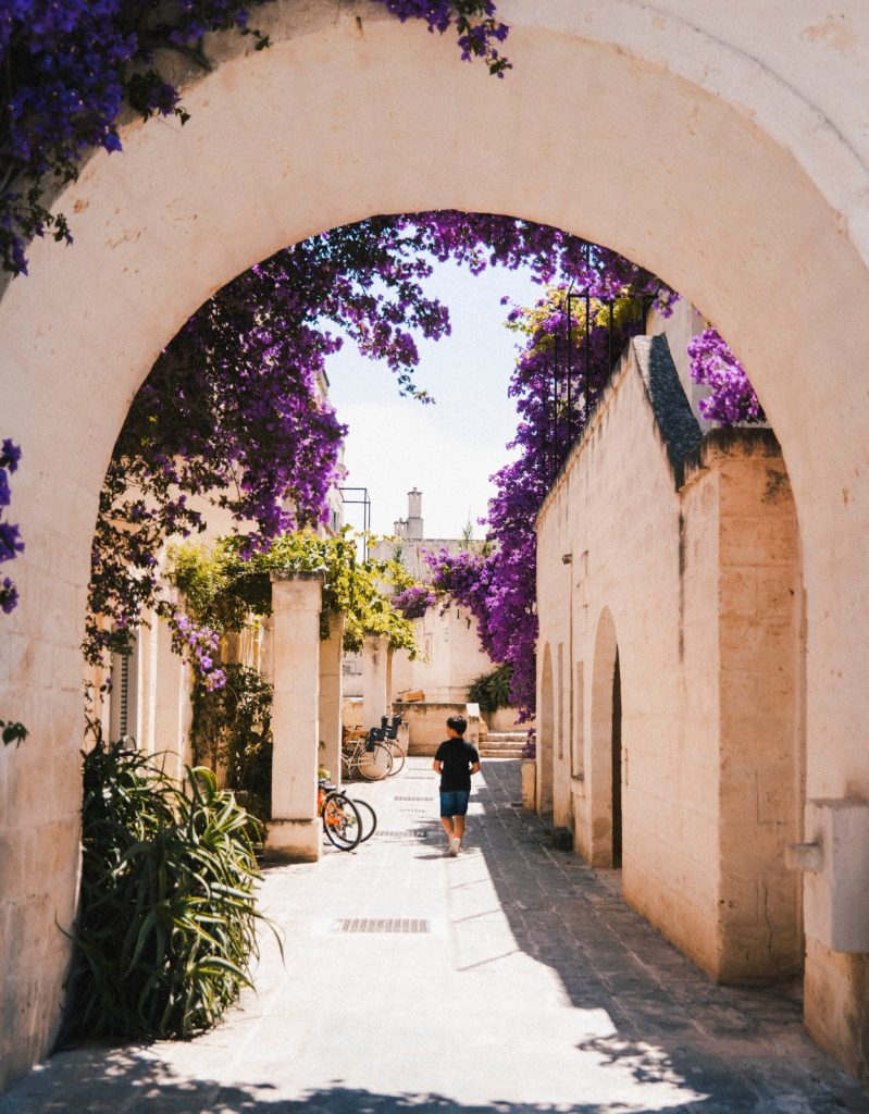 Le rose rampicanti, i gigli, le viti che si intrecciano alle pergole. E poi, il glicine che in primavera ricopre le pareti, regalando passeggiate dipinte di viola.
