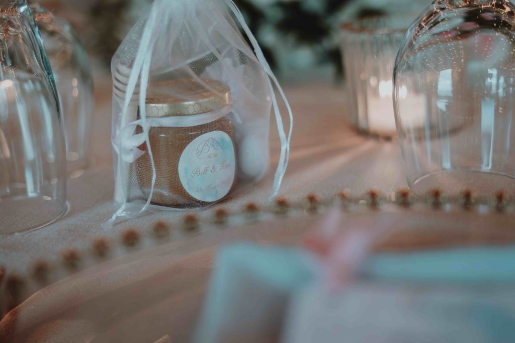 Raffinata la mise en place resa unica da diversi elementi: posate e bordi di piatti e bicchieri nelle tonalità del gold, il menù che riprendeva la grafica della stationery e il cadeau per gli ospiti, una boccetta di miele locale.