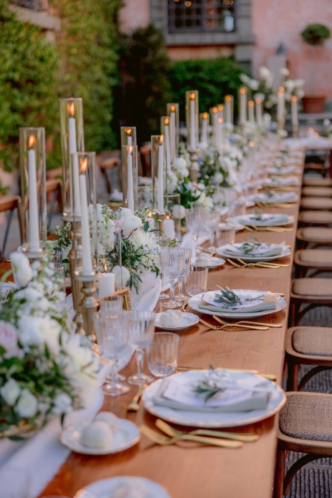 Nessun dettaglio è stato lasciato al caso dal team di Tuscan Wedding Events, che ha soddisfatto ogni desiderio della coppia: dall’acqua di colonia di Santa Maria Novella che ha profumato la sposa e gli ambienti all’accurata mise en place sui toni del bianco e dell’oro, fino alla ricercata wedding stationery. Romanticismo ed eleganza, queste le parole chiave delle nozze.