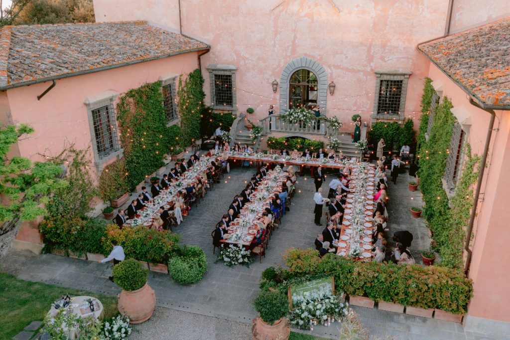 È anche per questo motivo che per la cena sono stati utilizzati dei tavoli in legno disposti a ferro di cavallo nel baglio antistante Palazzo Machiavelli. Le decorazioni floreali posizionate lungo la balconata della villa hanno incorniciato la scena. Uno scenario intimo è proprio quello che Chris e Carly desideravano per il momento clou del loro Destination Wedding.