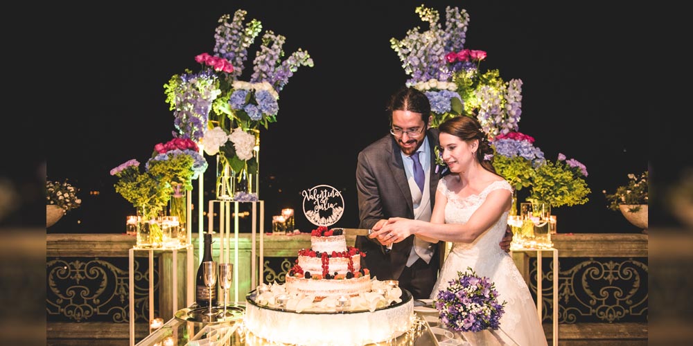 Un sogno ad occhi aperti. Barbara Poma di Bonheur du Jour ha organizzato una romanticissima cerimonia simbolica sulla terrazza durante la quale, Valentina e Julio si sono giurati amore eterno. Sul percorso degli sposi, c’era una scia di petali bianchi e lilla. Particolari i decori che hanno reso indimenticabile, la già spettacolare Villa Muggia.