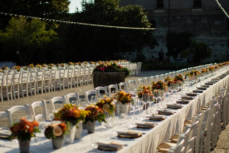Due tavoli imperiali sono stati imbanditi a festa. Per ognuno, il nome di un vino prodotto dall’azienda di famiglia.