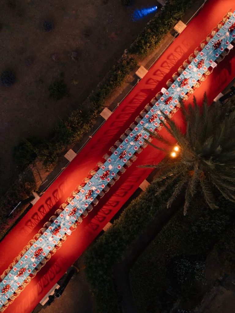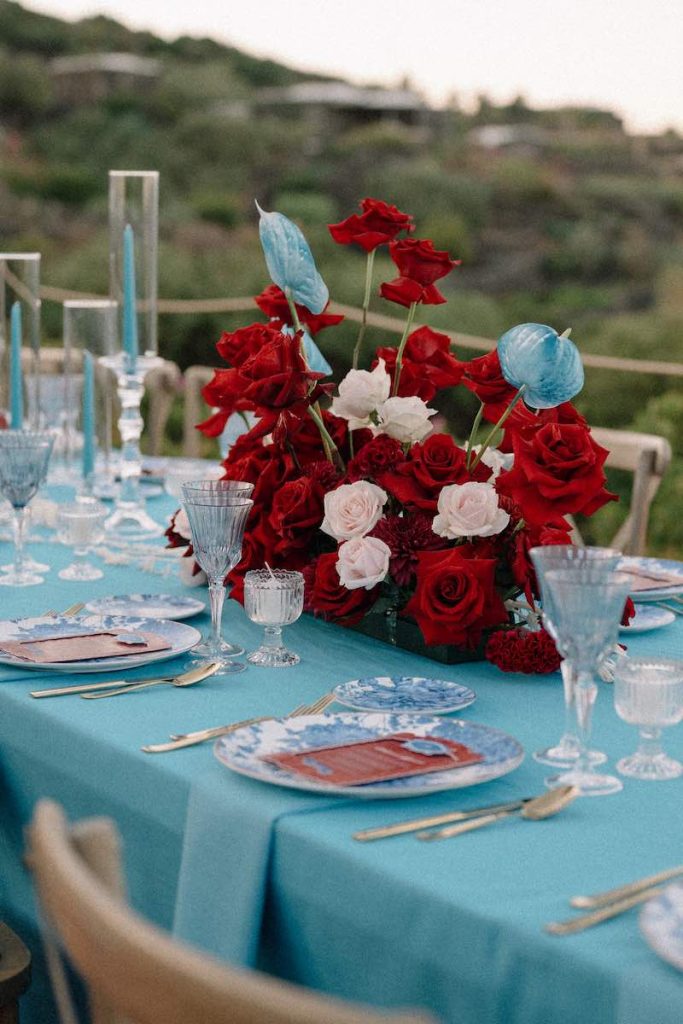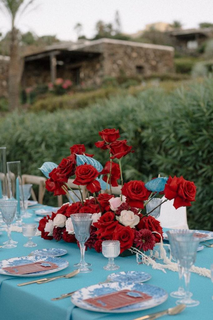 A vestire la tavola, un tovagliato turchese per riprodurre il colore delle onde che circondano l’isola, accostato a pennellate di rosso corallo che evocavano un’idea di passione e glamour.