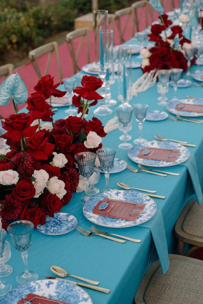 L’attenzione è tutta per i dettagli: dal menù disegnato ad hoc al piatto – che ne riprende il mood – alle composizioni floreali fortemente scenografiche create con le rose come protagoniste, disposte come una fioritura spontanea e abbinate ad anthurium dall’aspetto grafico.