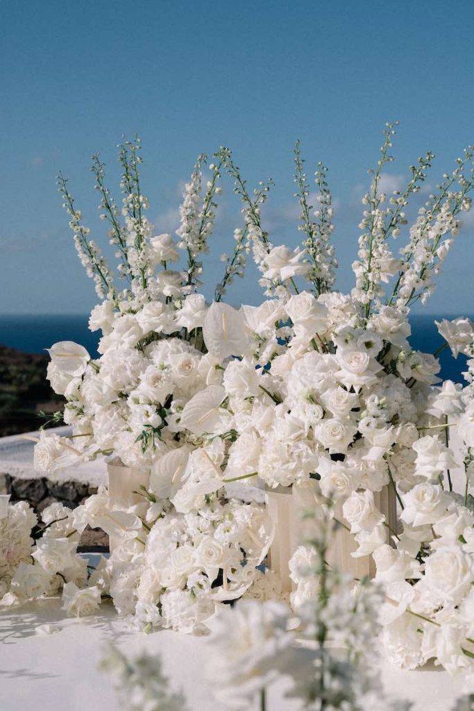 Fin dalla palette cromatica che giocava tra l’arancio e il fucsia rompendo volutamente con il Total White della location e introducendo fin da subito un’energia vibrante e contemporanea al racconto d’amore dei due sposi.