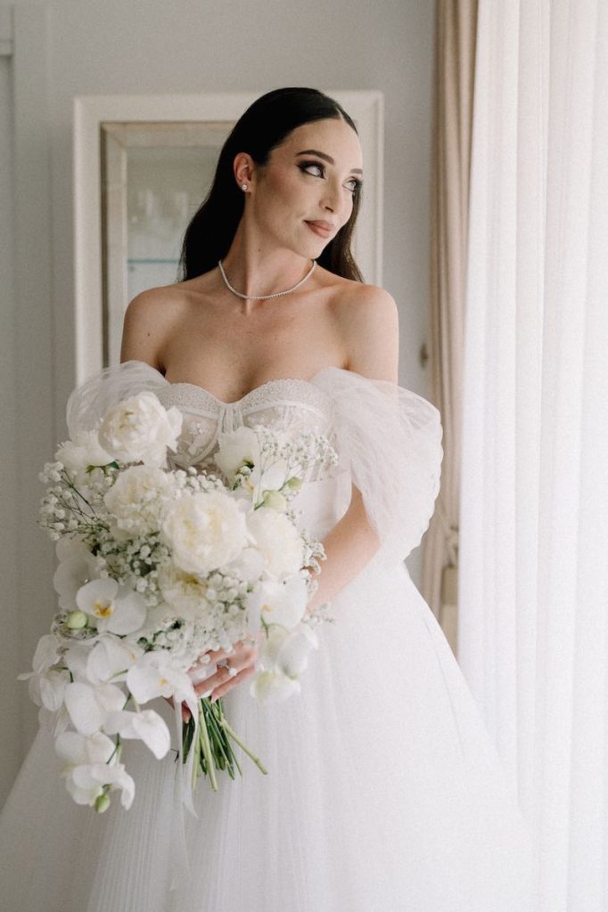 Scenografico anche il bouquet della sposa, a cascata, composto da orchidee, ortensie, rose inglesi e gypsophila, in dialogo perfetto con tutto l’allestimento floreale.