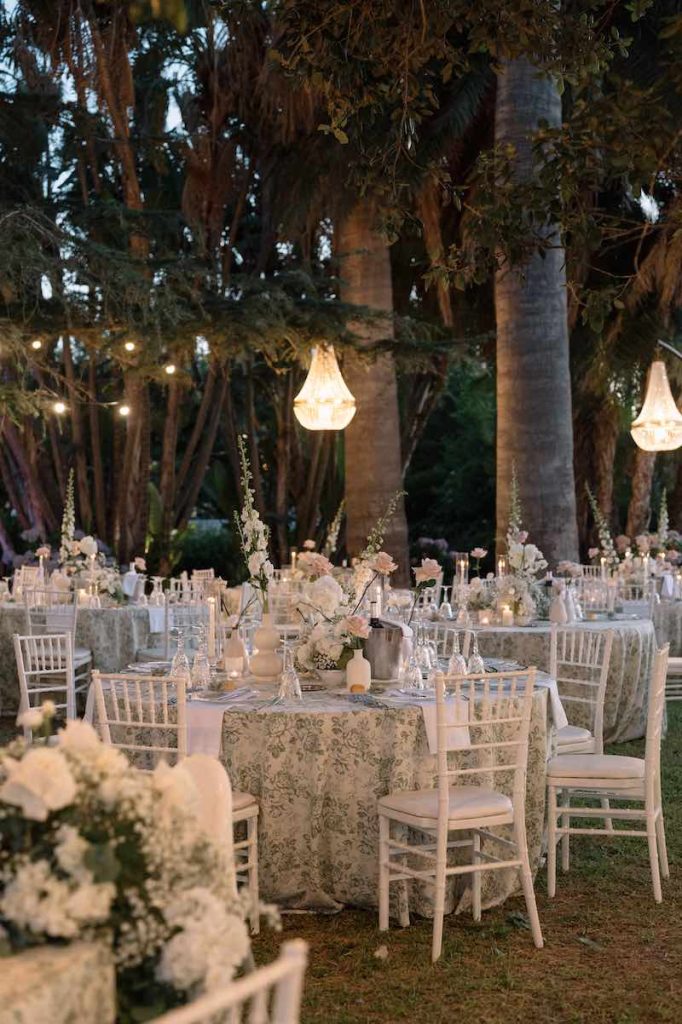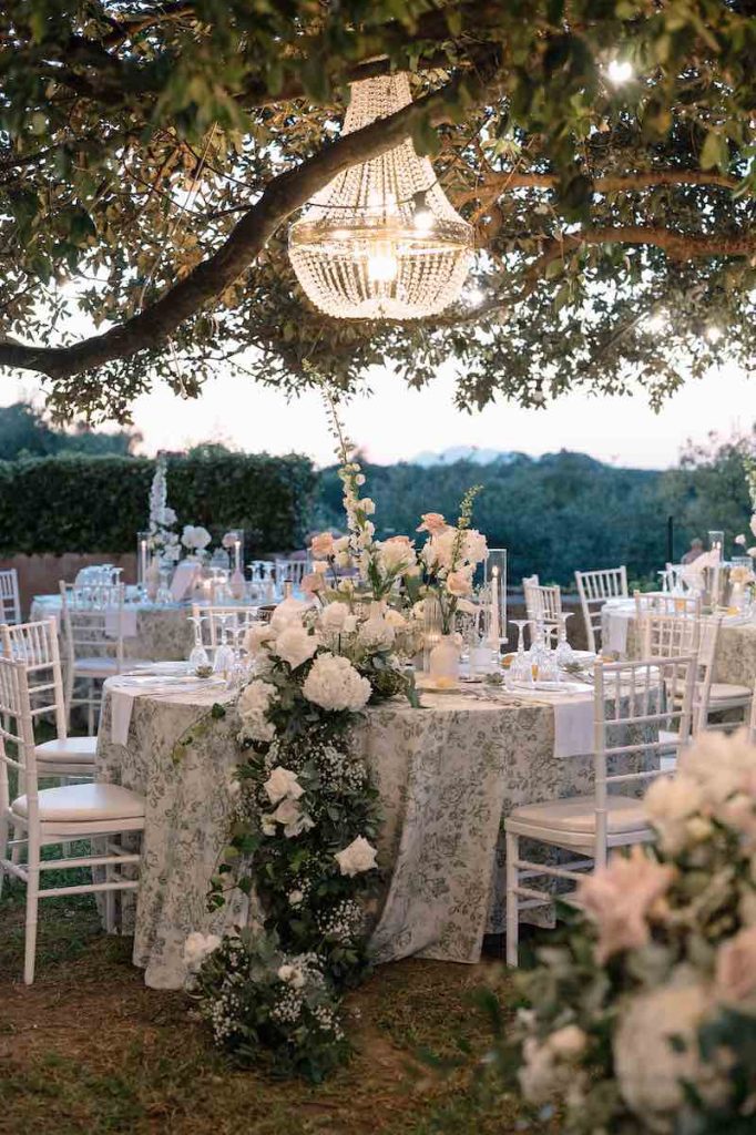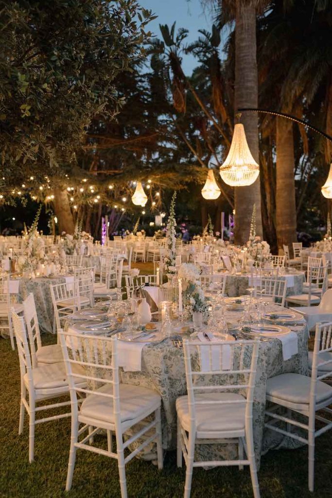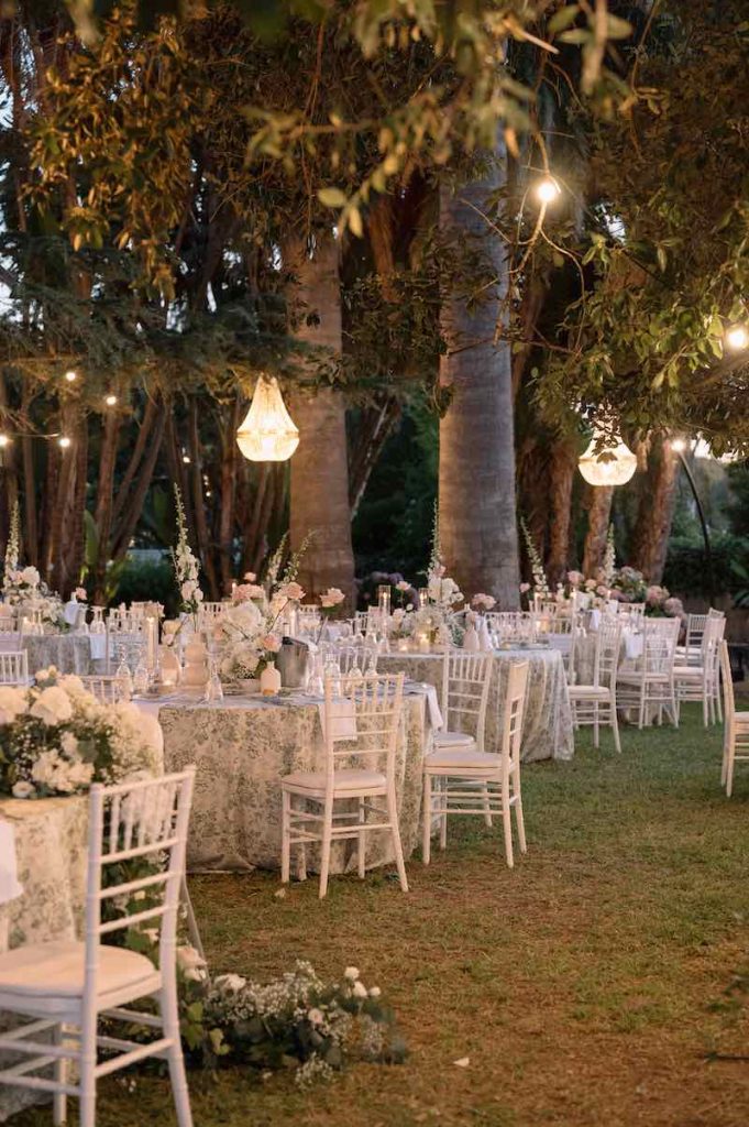 Il light design ha completato la magia: candele, lucine sospese e chandellier disposti tra gli alberi, come se scendessero direttamente dai rami, creando una vera atmosfera da fiaba sotto le stelle.