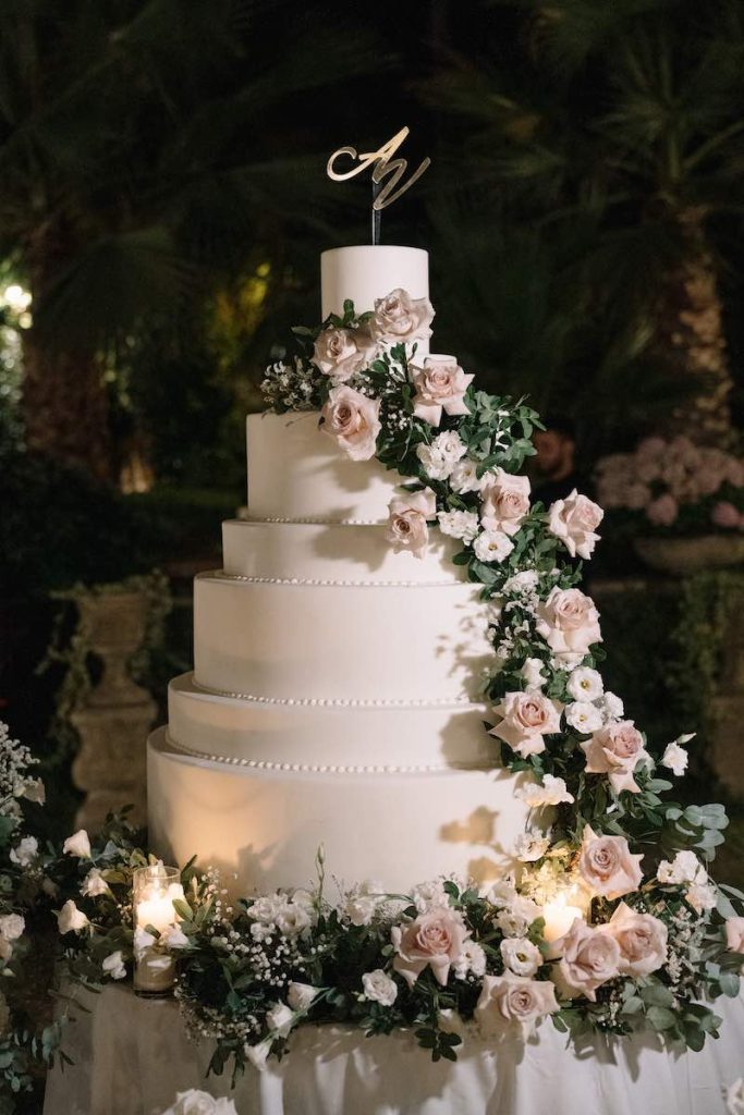La Wedding Cake, imponente e a più piani, era decorata con un’elica di rose rosa lavorate a mano, in dialogo con le rose bianche in stato vegetativo disposte attorno al tavolo.