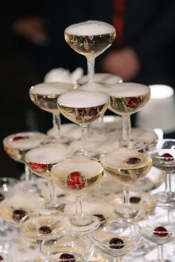 Accanto, una scenografica Champagne Tower, con una ciliegia in ogni coppa, ha aggiunto un tocco rétro e glamour.