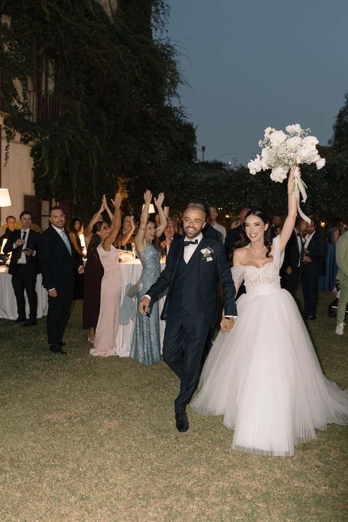 Al termine del rito, un momento inatteso: grazie ad un gentile omaggio del sacerdote, gli sposi hanno salutato amici e parenti dal balcone della chiesa, con un’uscita dalla cerimonia carica di gioia destinata a restare iconica.