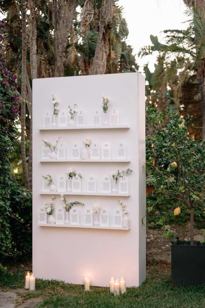 Gli ospiti sono stati accolti da un tableau de mariage di design, decorato con mini-plexiglass e vasetti floreali di diverse dimensioni.