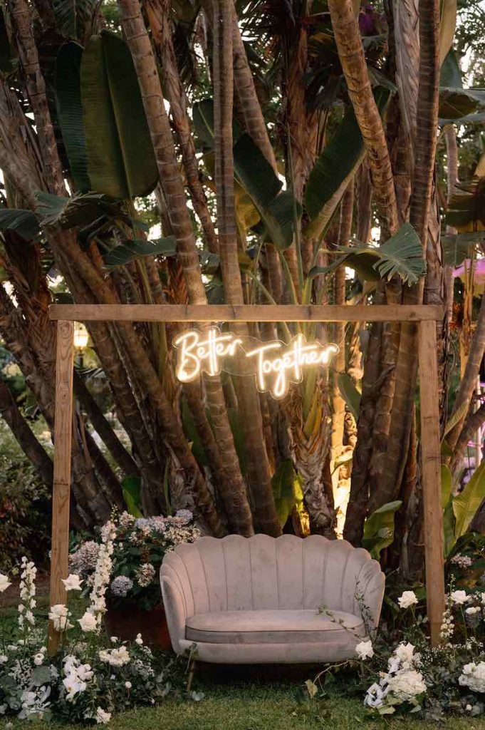 Accanto, un Photobooth con divanetto in velluto color tortora e scritta luminosa “Better Together” ha aggiunto una nota divertente e coinvolgente.
