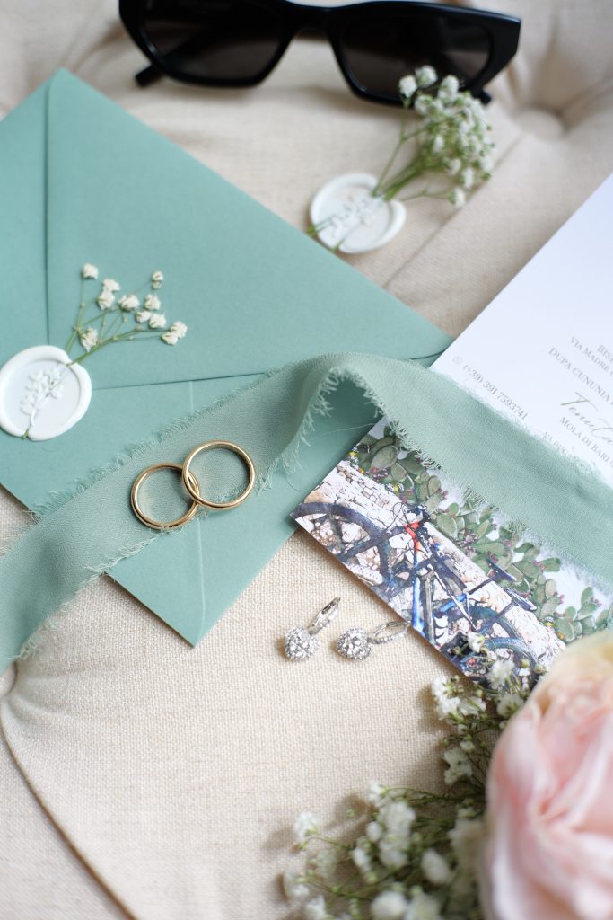 Nasce così un invito illustrato a mano da Carmen stessa, che ritrae gli sposi dopo la proposta. Buste verde salvia, dettagli in ceralacca e liner illustrati a mano, richiamano il racconto degli sposi, catapultando anche gli ospiti nelle atmosfere che hanno contribuito a creare la loro storia d’amore.