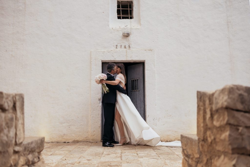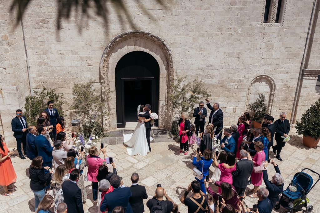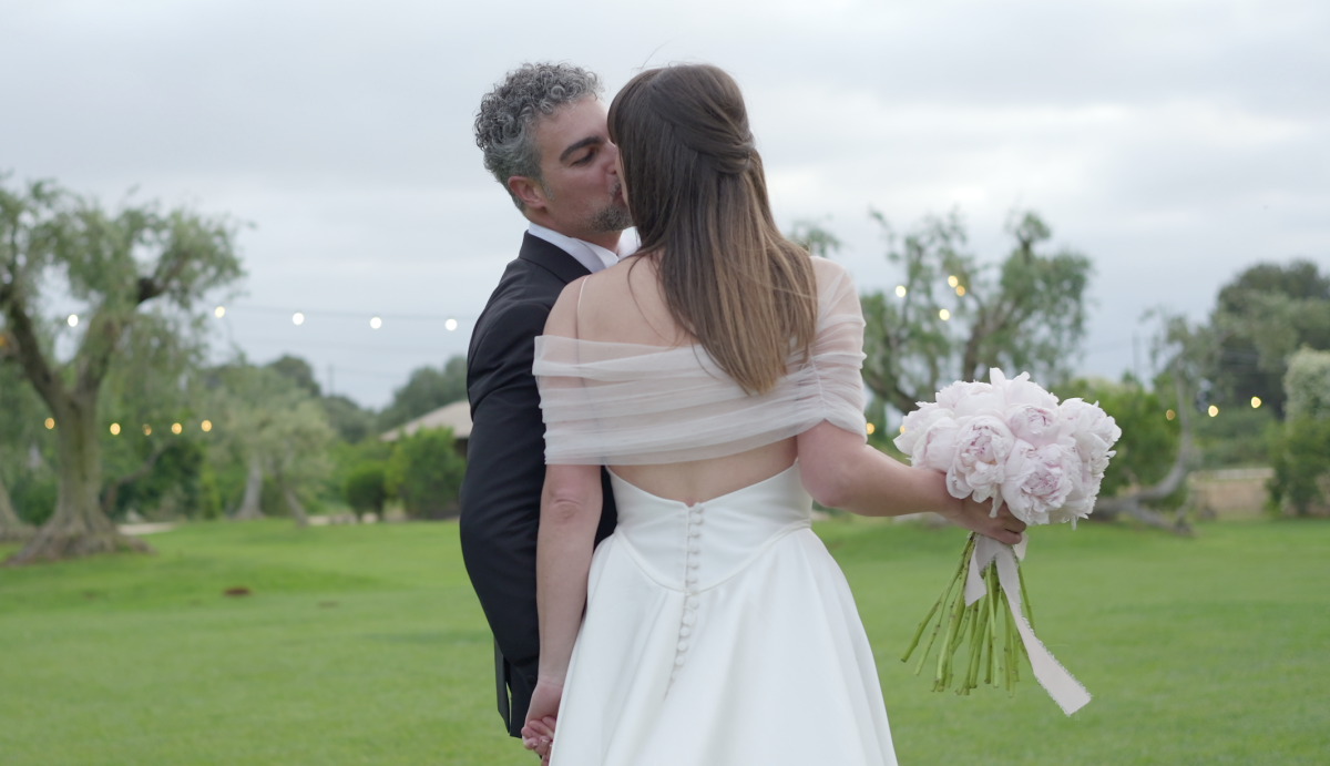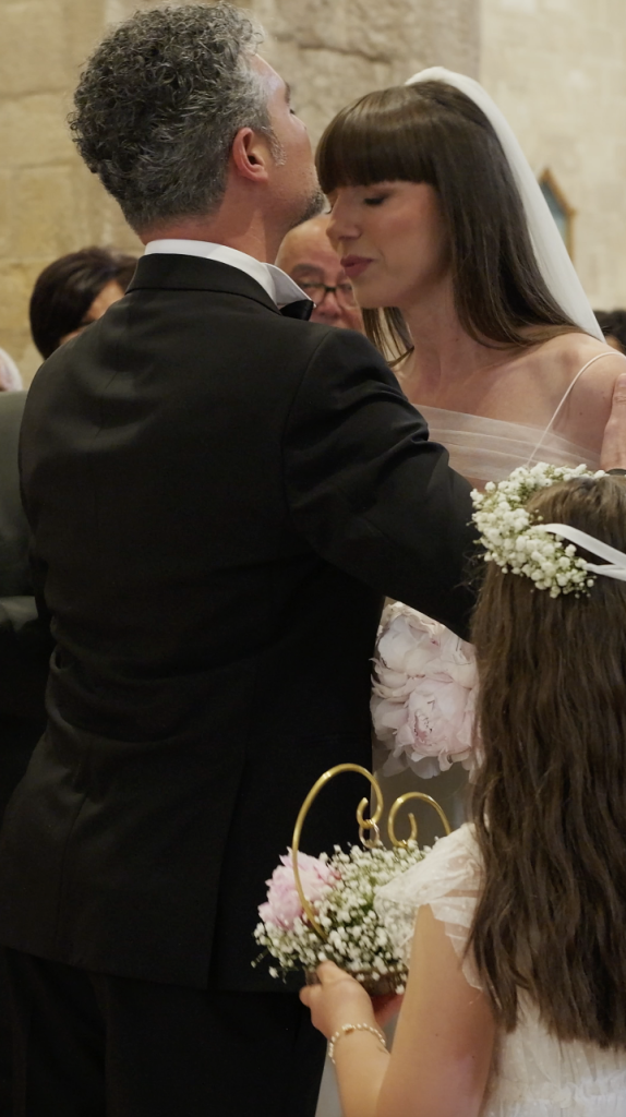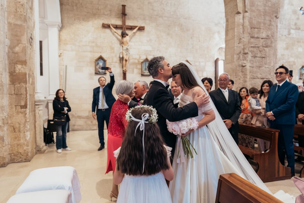 La cerimonia religiosa si svolge nella chiesa di riferimento dello sposo, in Puglia. Un rito intimo, reso ancora più autentico dalla scelta dei testimoni a sorpresa durante la celebrazione: un gesto spontaneo, carico di significato.