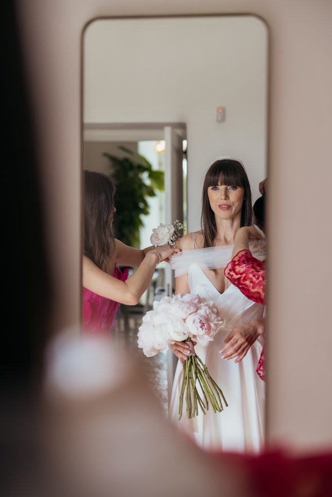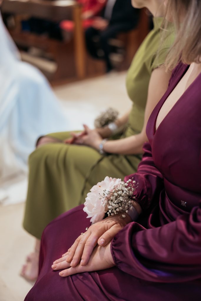 Lo stesso linguaggio floreale si ritrova nei bracciali realizzati per le damigelle, piccoli dettagli intimi che hanno rafforzato il senso di complicità durante la preparazione.