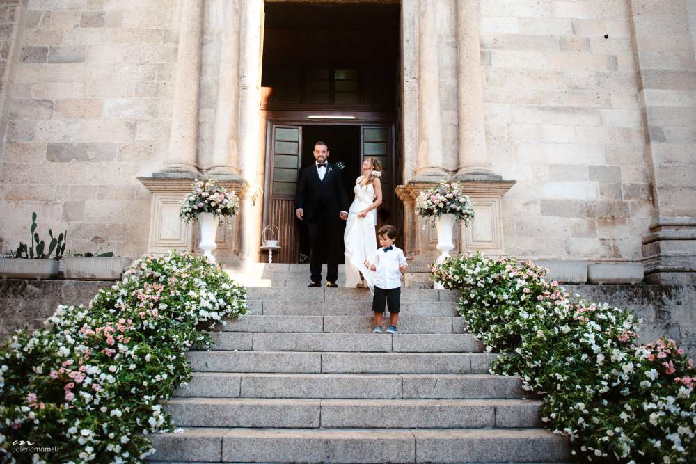 Nessun dettaglio è stato lasciato al caso. Dalla scalinata della chiesa fino agli allestimenti in giardino, i colori predominanti erano il bianco e il rosa. “Mille piccolissimi fiorellini incorniciavano la scalinata che porta alla chiesa – racconta Sara Carboni, anima di Sara Events -. Sembravano delle nuvole e regalavano uno spettacolo inatteso e un festoso benvenuto”.