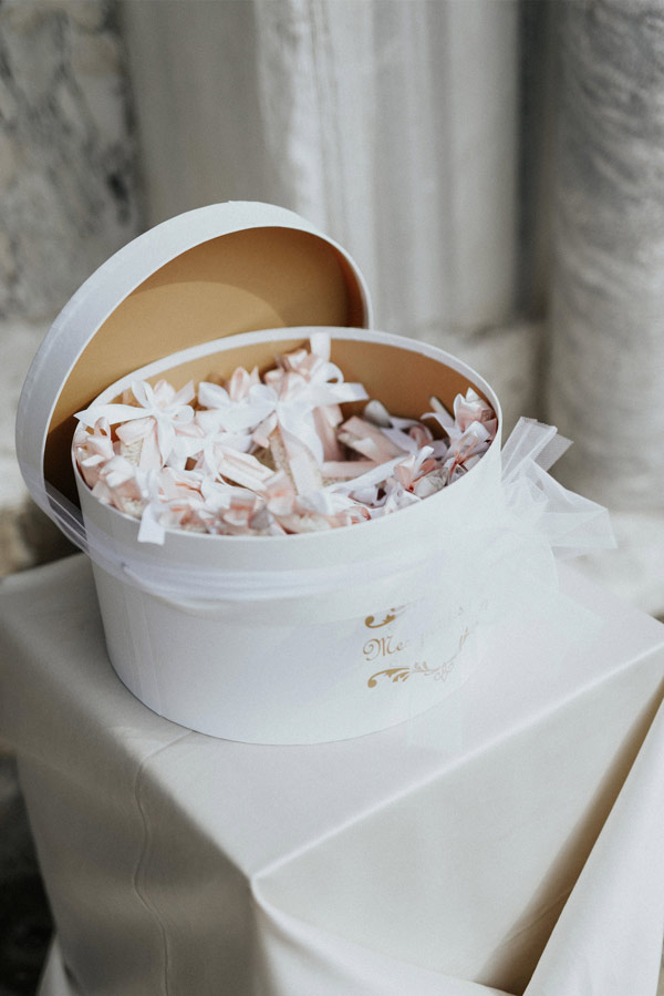 Come per tutti i suoi matrimoni, la cura nei confronti degli invitati è stata impeccabile. Tanti i piccoli accorgimenti: un ventaglietto creato a mano per l’occasione, la bottiglietta nella bag e un programma con indicate tutte le informazioni sul matrimonio.