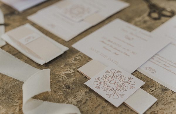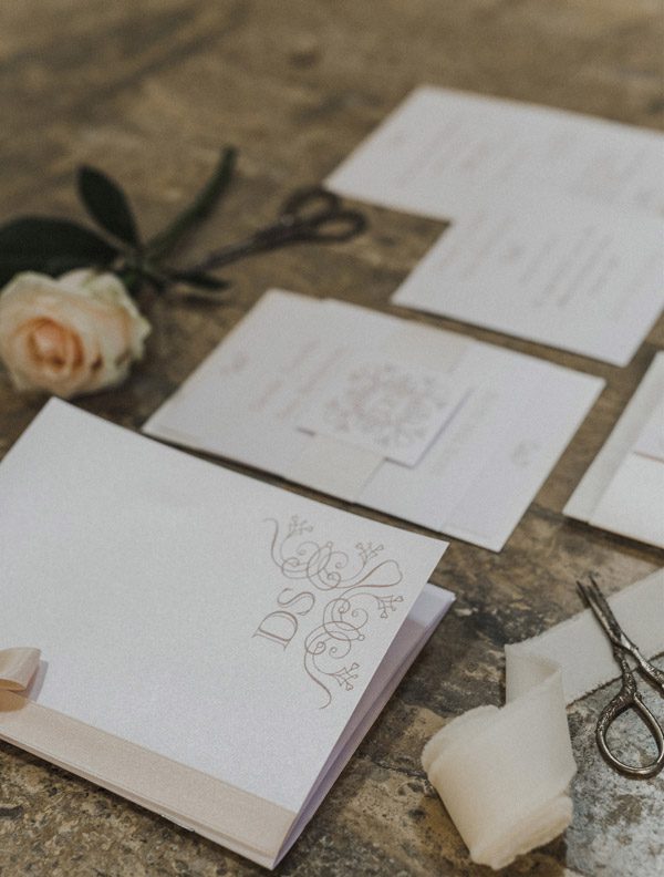 Come dettaglio ricorrente, il logo con le iniziali degli sposi riprodotte minuziosamente su ogni singolo elemento. Dall’invito personalizzato per gli sposi alle bag fino ai libretti messa. Il ghirigori invece faceva da cornice alle iniziali e si ripeteva in tutte le stampe, i cartoncini dei tavoli , i tag dei confetti e il tableau de mariage.