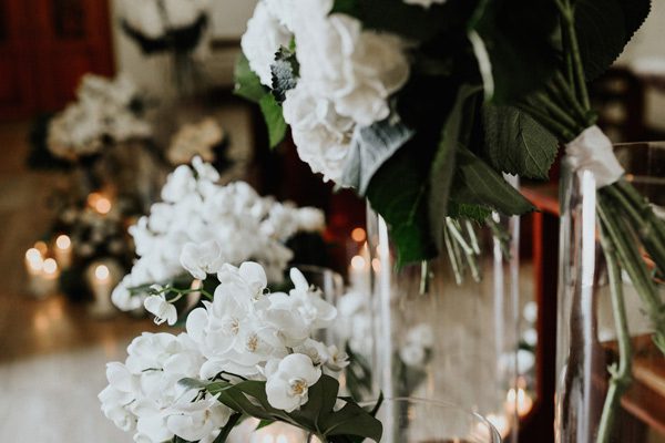 Per seguire il fil rouge e la palette colori del matrimonio (bianco, verde, rosa cipria) la wedding planner Cristina Orsatti ha scelto come fiori per l’allestimento: il lisianthus e le orchidee bianche, la rosa talea dalle nuance cipriate e le ortensie sia verdi che bianche. Per il bouquet della sposa invece, il pisello odoroso.