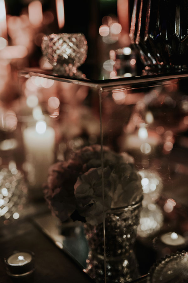 Per Davide e Sara la wedding planner ha pensato ad una ricca e suggestiva confettata con calate di candidi fiori, candele, ricercati recipienti e strutture cubiche a specchio.