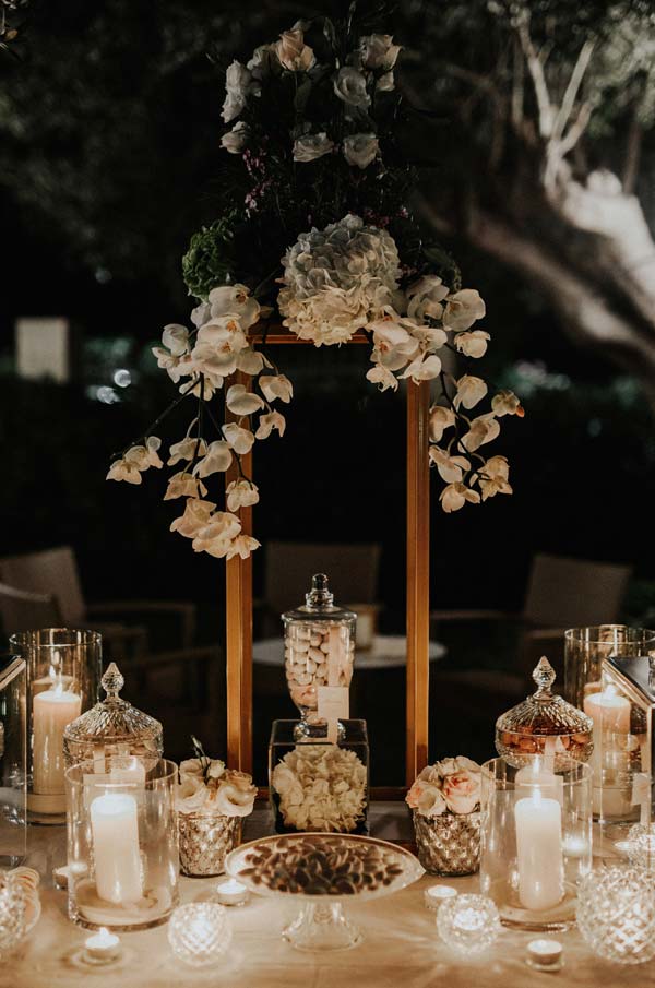 Anche l’originale tableau de mariage è stato studiato, progettato e personalizzato dalla wedding planner che, attraverso composizioni, torchon di fiori, candele e parallelepipedi minimal ha dato vita ad una affascinante “cornice sul mare”.